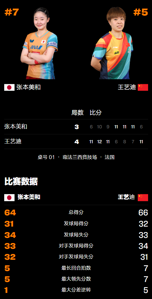 第五局王艺迪重振旗鼓,再次开局领先张本美和,但对方也拼得非常凶,不断咬住比分并追平对手,战况随即陷入胶着,后半段王艺迪发挥不佳7-10落后被日本选手拿到局点,挽救1分后正手位被突破8-11再负,比赛悬念被张本美和延续了下去。