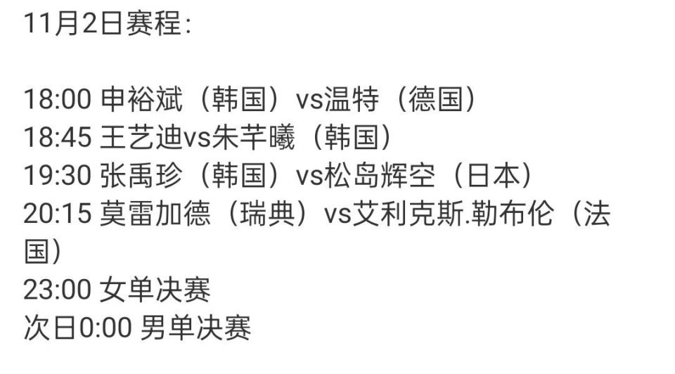 按照11月2日赛程,先进行四场半决赛,申裕斌vs温特、王艺迪vs朱芊曦、张禹珍vs松岛辉空、莫雷加德vs艾利克斯.勒布伦,其实随着桥本帆乃香、张本美和两人出局,王艺迪的夺冠之路相对轻松很多,可能后面两场反而没有之前费劲,但即使如此也不能太掉以轻心,还是得重视朱芊曦。