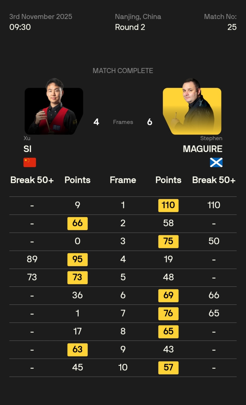 小庞开场首局打出单杆77分,先声夺人,不料海菲尔德连轰两杆破百两杆单杆50+,一波四连鞭,4-1建立领先,庞俊旭一轮三连击,4-4扳平大比分,海菲尔德再轰两杆单杆制胜,锁定胜利。