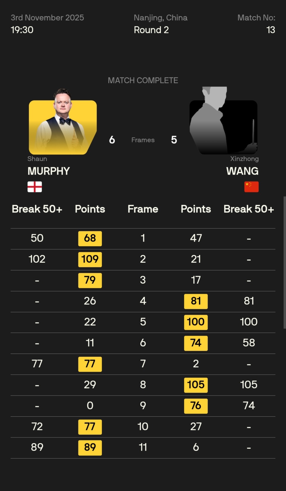 14小孩哥王信仲,开场被大嘴墨菲施以三连鞭,小王哥连续三杆单杆致胜,强势扳平,墨菲拿下第七局后,王信仲又是两杆单杆致胜,先达赛点,非常非常可惜,后两局被老奸巨猾的墨菲抢下,全场打出两杆破百、无缘拿下自己面对世界冠军的首场胜利。