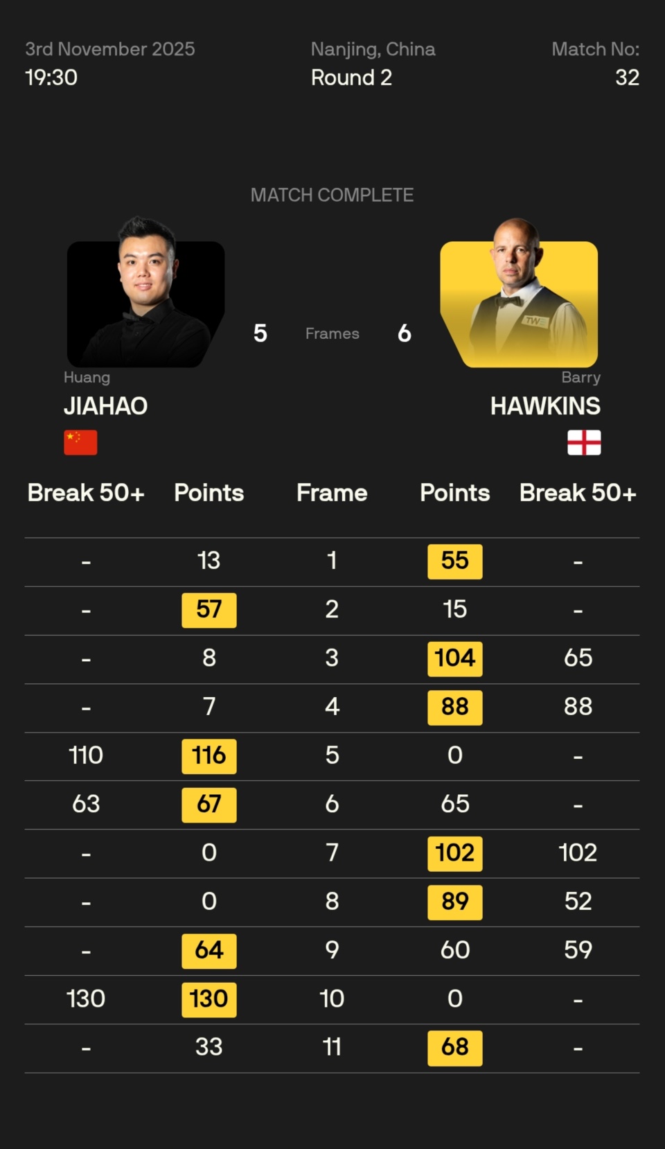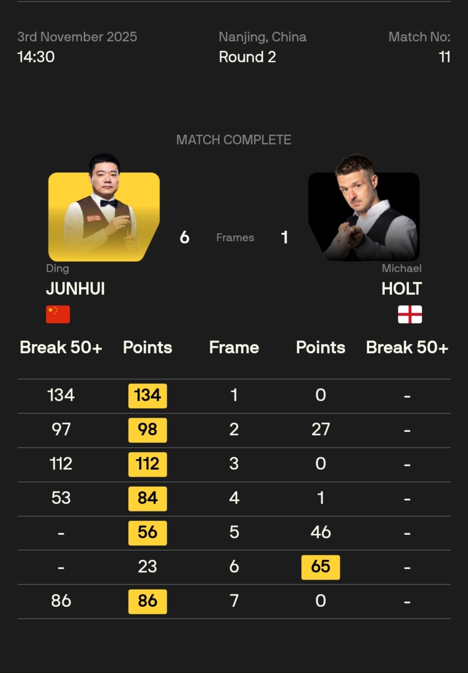 丁主任打出两杆破百、两杆单杆50+,一波五连鞭,来到赛点,霍尔特全场三局挂蛋,一局拿到1分,没有一杆连续进攻,仅仅拿下第六局一个胜局,被死死拿捏。