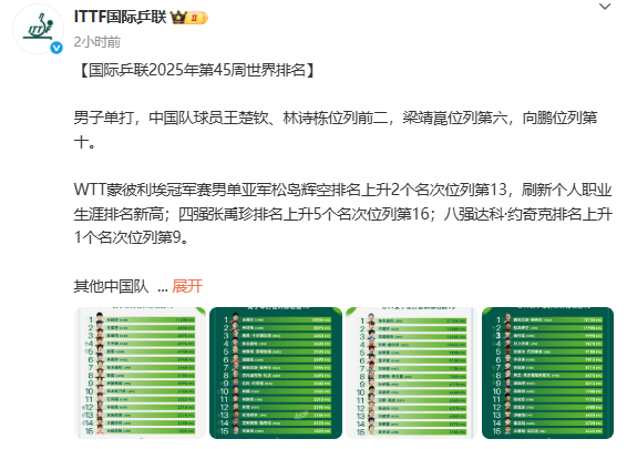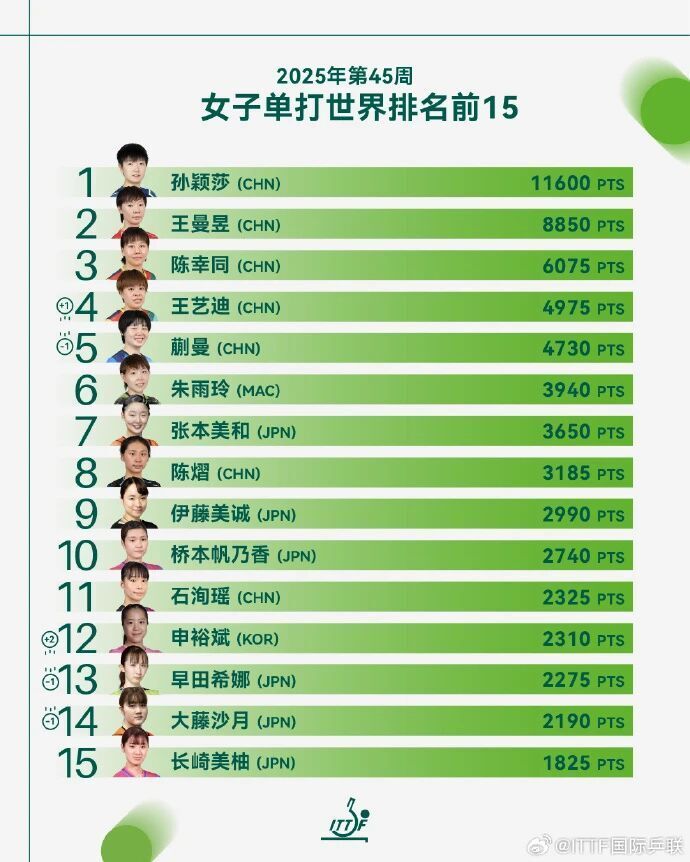 与此同时,国际乒联也在今天公布了2025年第45周世界排名。女子单打方面,国乒包揽前五名,而在前十名中有6名中国选手。其中,孙颖莎继续高居女单世界第一位,她的积分高达11600分,断层领先于其他选手。值得一提的是,这是孙颖莎连续第173周霸榜世界第一!