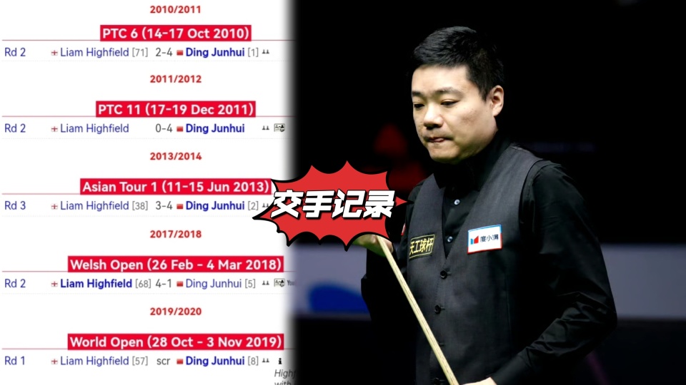 丁俊晖与海菲尔德交手记录如下