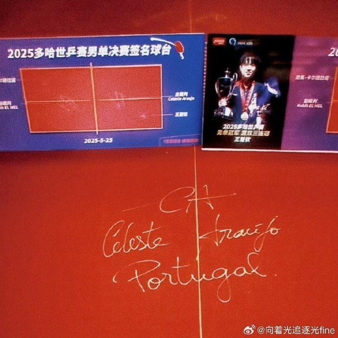 王楚钦夺冠后,他和雨果,还有担任执裁工作的两名裁判,都在球台上签名留念。