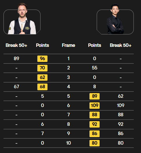 短休后,第5局,吴宜泽失误后,一杆制胜的好局面,特鲁姆普的黑球失误,竟然成了比赛的转折点。吴宜泽开启连续一杆制胜模式,打出单杆62、108、88、92、86分,5-4反超。第10局,手感冰冷的小特一杆荒腔走板的长台失误后,吴宜泽又是一杆制胜,单杆76分,一波6连鞭,6-4淘汰特鲁姆普。
