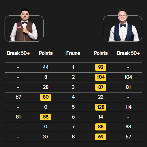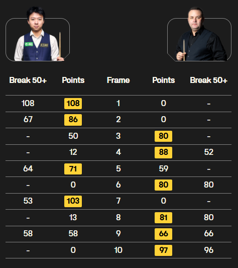 苏蒂在与肖国栋和罗伯逊的两场比赛中,单杆表现都非常亮眼。