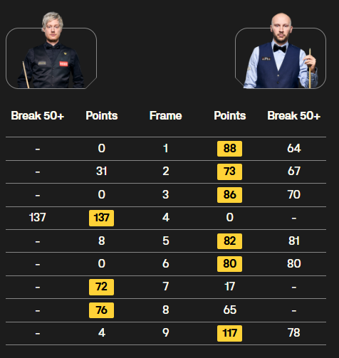 希金斯和唐纳森的比赛,双方陷入漫长的鏖战。决胜局,希金斯一杆89分绝杀晋级。这样上半区保留两位TOP16,下半区是3位。