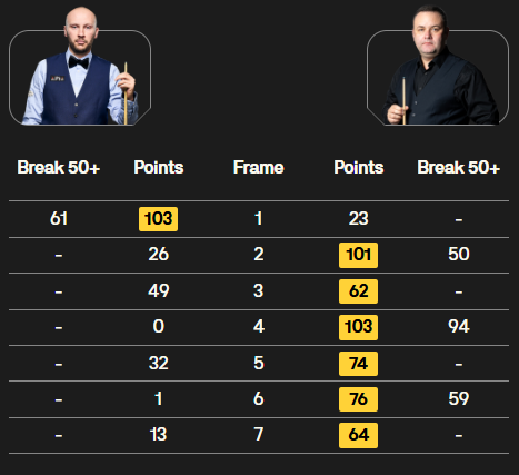 前四局,希金斯开局单杆77分制胜,第2局破百,第4局,抓住墨菲安全球失误,单杆67分制胜,3-1领先。短休后,墨菲一杆破百扳回一城。随后,希金斯又连下两局,其中第7局破百,5-2到赛点。第8局,墨菲单杆52分后,打丢延分的粉球;希金斯提前布局,最后抓住长台机会,一杆清台,单局逆转,同时6-2锁定胜利。