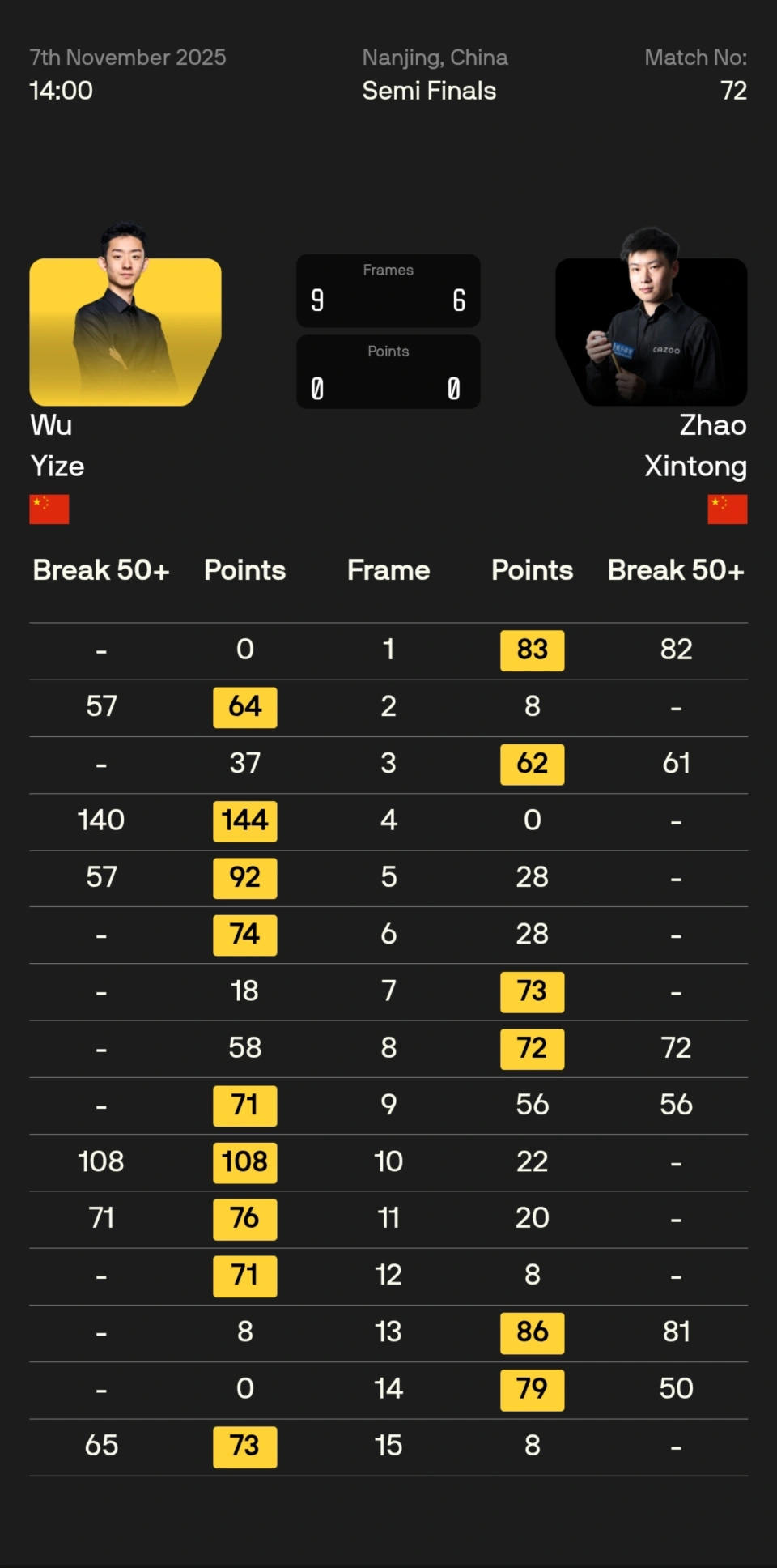 本站比赛之前,两人本赛季排名赛的最好成绩都是16强,赵心童与吴宜泽分别在沙特大师赛和英格兰公开赛中,止步于16进8轮次,南京国锦赛,两人同时跻身四强,让人顿生无限遐想。