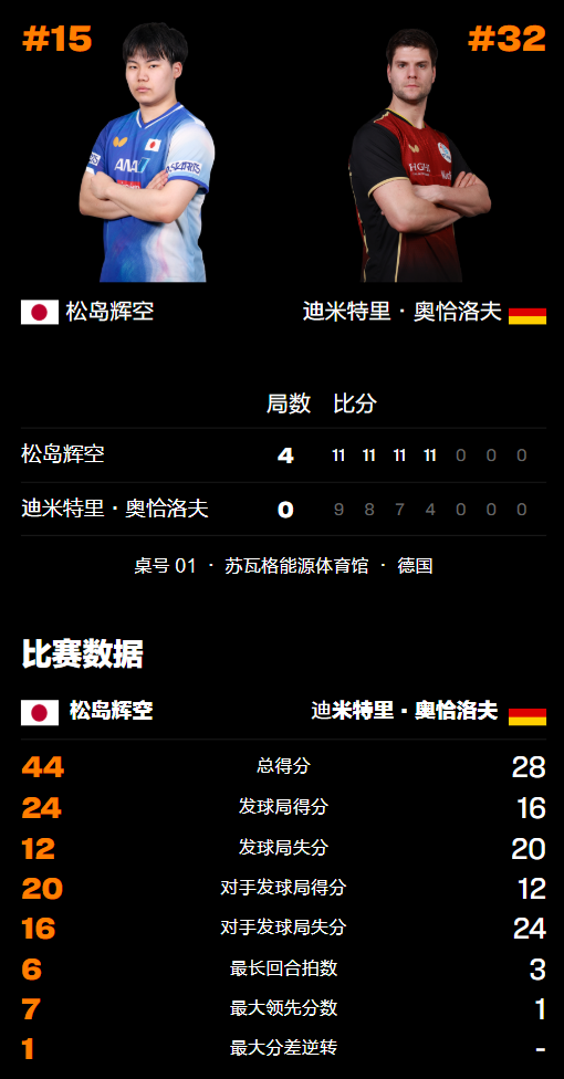 第三局松岛辉空坚持近台以快打慢,而且出手非常坚决果断,不过中间段被奥恰洛夫缠住比分战至5-5平,随后8-5再次领先逼德国队用掉暂停权,回到赛场后以9-5、10-6领先错失1个局点,但最终还是以11-7拿下,距离胜利仅一步之遥。