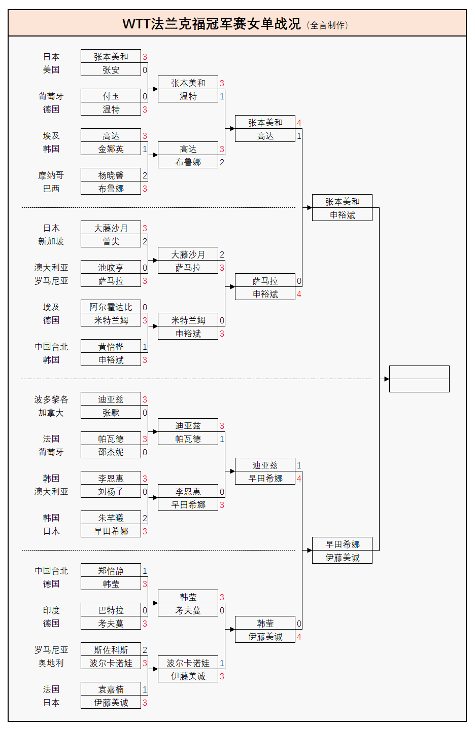 WTT冠军赛:女单4强诞生!日本3人晋级,伊藤美诚4-0奥运亚军