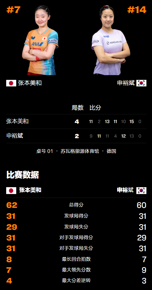 在此之前,两位运动员曾经在国际比赛中有过7次交手,结果张本美和6胜1负明显占优,2023年至今已经保持5连胜,所以此战申裕斌面临严峻考验。