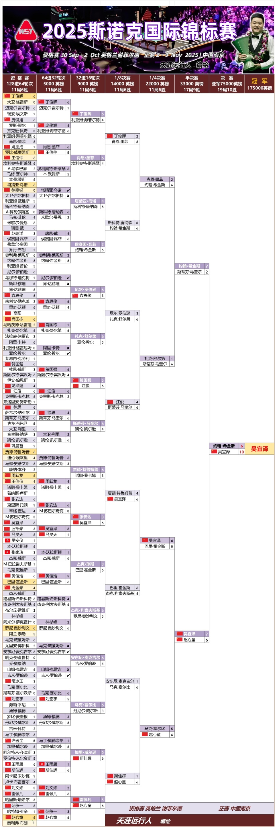 第二阶段比赛开始,吴宜泽将比分扩大至8-5,第14局吴宜泽顶住压力,强势拿下赛点,第15局希金斯打出单杆53分,挽救一个赛点;第16局吴宜泽轰出单杆108分,一杆制胜,以10-6战胜约翰·希金斯,夺得2025斯诺克国际锦标赛冠军,收获个人职业生涯首座排名赛冠军。