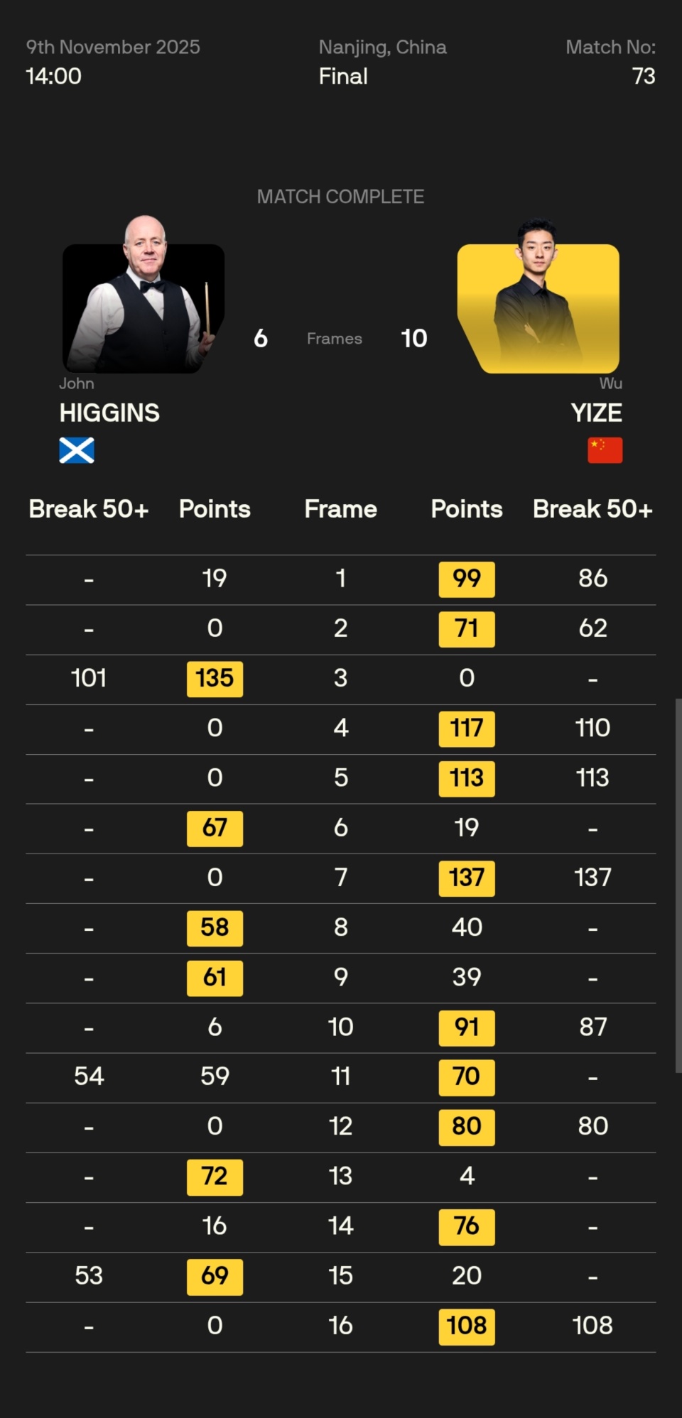 本场比赛,吴宜泽打出110、113、137、108分四杆破百和86、62、87、80分四杆单杆60+,约翰·希金斯打出一杆单杆101分和两杆单杆50+。