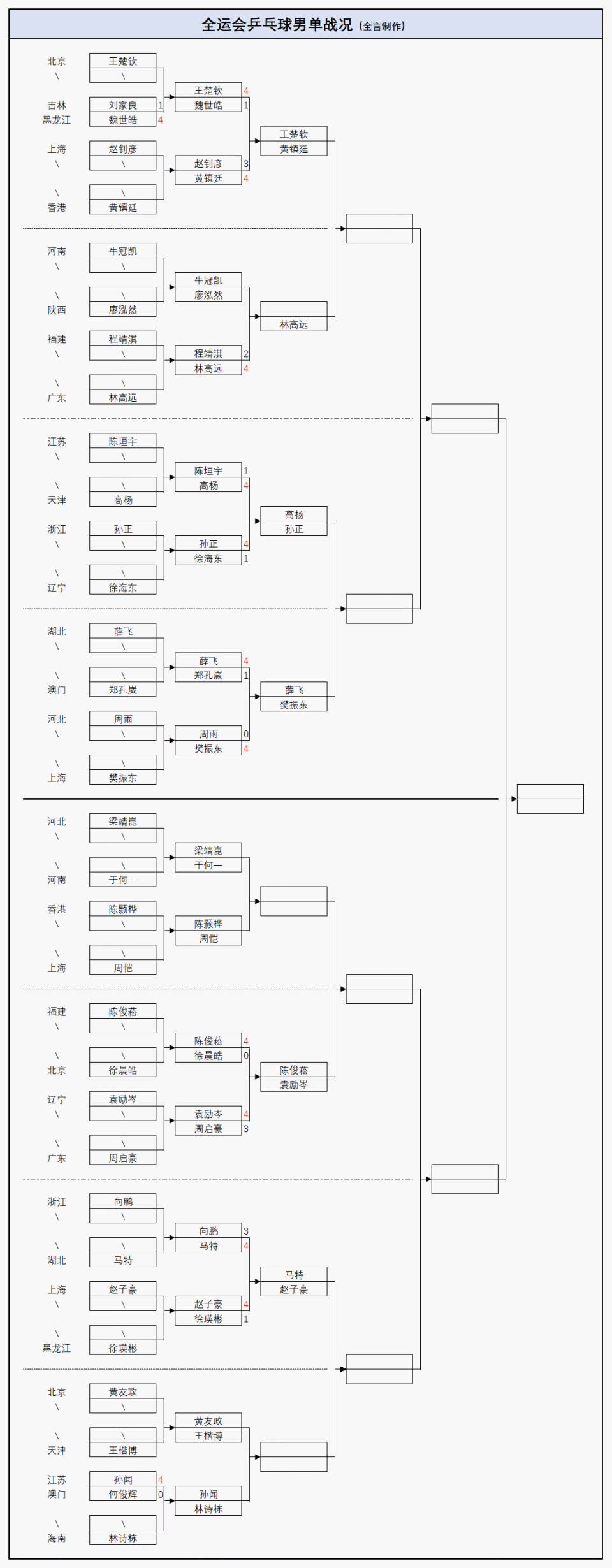 其余男单战况为:薛飞(湖北)4-1郑孔崴(澳门)、高杨(天津)4-1陈垣宇(江苏)、孙正(浙江)4-1徐海东(辽宁)、陈俊菘(福建)4-0徐晨皓(北京)、赵子豪(上海)4-1徐瑛彬(黑龙江)。