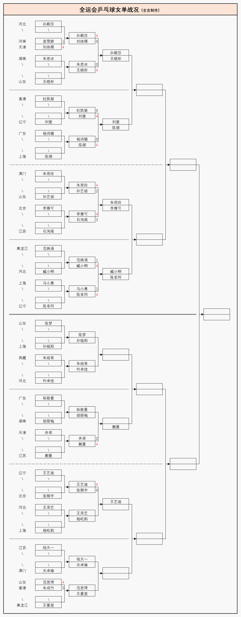 上海选手陈熠排名高居世界前十,最终毫无悬念地4-0淘汰广东的杨诗璐。至于河北的臧小桐4-1胜黑龙江的范姝涵、山东的王晓彤4-0胜湖南的朱思冰也不让人意外。