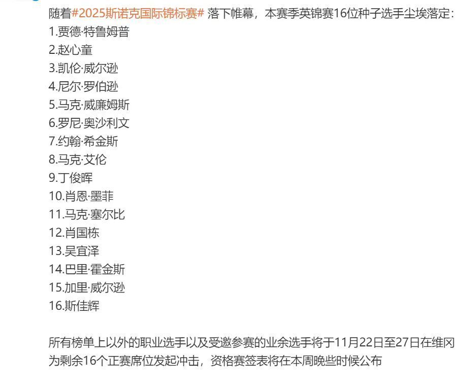 随着国锦赛结束,种子名单出炉:1贾德.特鲁姆普、2赵心童、3凯伦.威尔逊、4尼尔.罗伯逊、5马克.威廉姆斯、6罗尼.奥沙利文、7约翰.希金斯、8马克.艾伦、9丁俊晖、10肖恩.墨菲、11马克.塞尔比、12肖国栋、13吴宜泽、14巴里.霍金斯、15加里.威尔逊、16斯佳辉,14人是按世界排名。