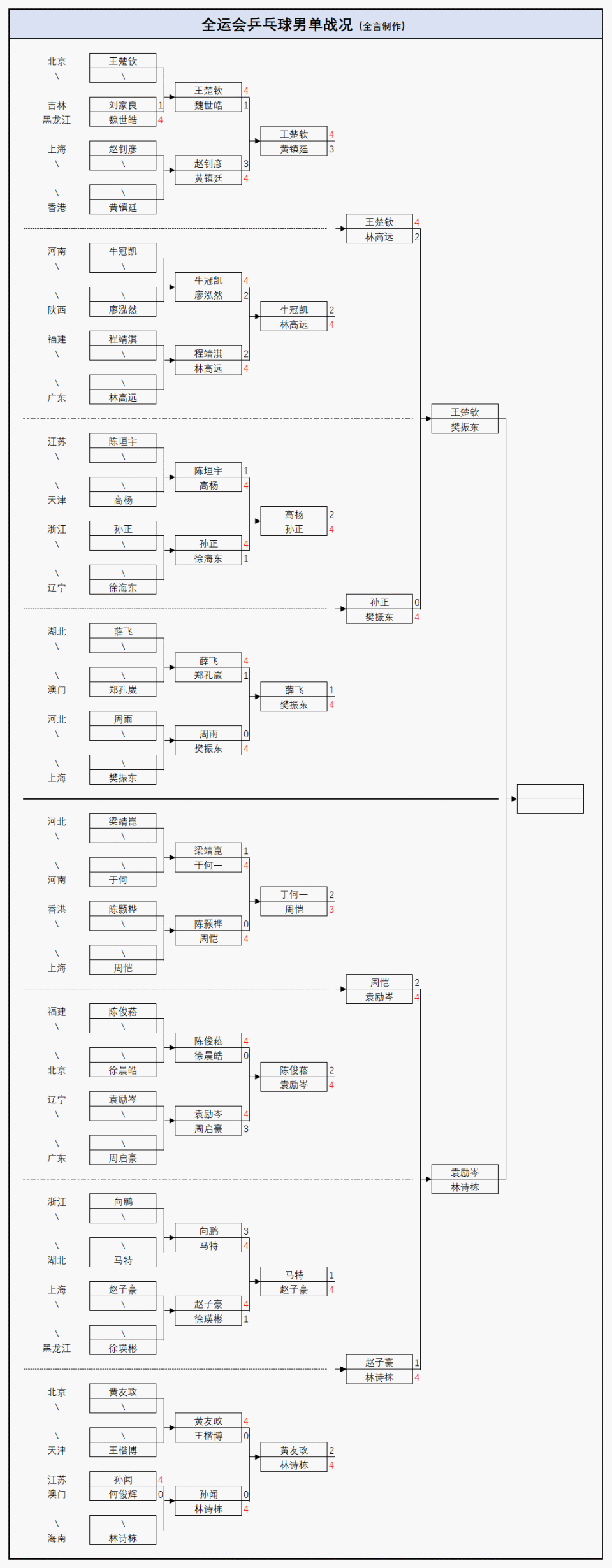 1/4区:王楚钦4-2林高远(11-9、8-11、12-10、11-5、7-11、11-4);