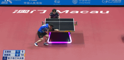 但是王楚钦在发球环节给樊振东极大压力——1比3,王楚钦发了一个台角保护的半出台,樊振东一吊,被早等在位置的王楚钦一个倒地爆冲。