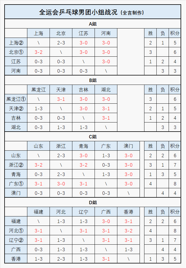 本组排名最高的是国乒内战高手徐瑛彬等人所在的黑龙江队,他们连赢3场锁定小组第一,而世界冠军老将郝帅与其天津队友经历鏖战后也拿到了2胜1负成绩过关,吉林、湖北选手表现不佳,最终止步小组赛阶段。