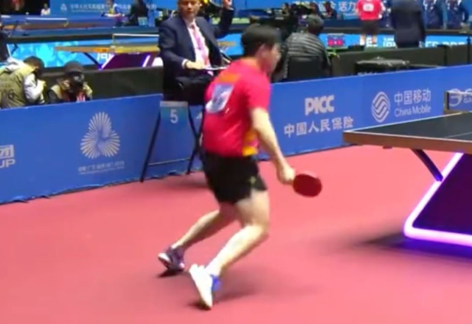 另外,在抽球的时候,樊振东没有站稳,不慎双膝跪倒在地。接下来的一幕让人无比吃惊:跪倒在地的樊振东,没有借助任何外界力量,直接从地面弹了起来。注意,是真的弹了起来,他的身体有一个明显前冲的动作。