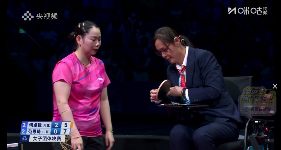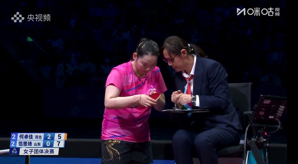 这局比赛,何卓佳比分5-7落后,突然发现球拍出了问题。