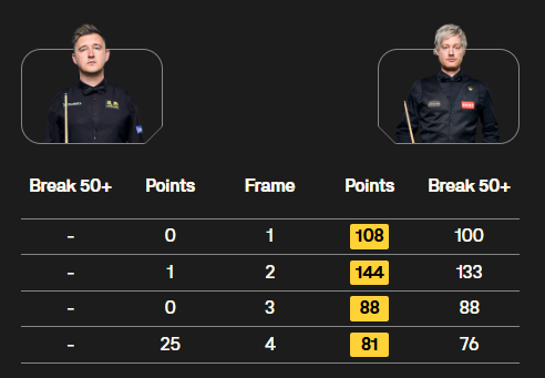 罗伯逊破百开局,第2局,囧哥主动承认连击犯规,罗伯逊接手,再轰一杆破百。第3局,罗伯逊长台上手,一杆88分制胜,3-0到赛点。第4局,囧哥上手后,K球堆误进红球犯规,罗伯逊接手打出一杆76分,4-0终结比赛。