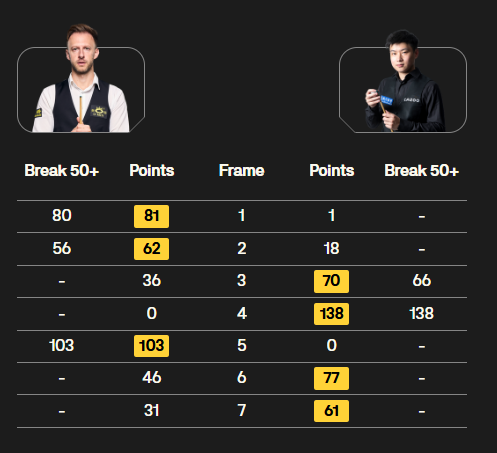 特鲁姆普打出两杆50+,2-0开局。第3局,小特失误后,赵心童神准长台上手,单杆66分完成超分;第4局,赵心童轰出138分破百清台,扳平比分。