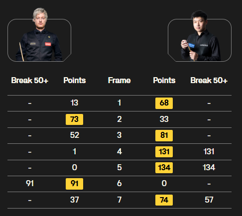 前两局,双方各胜一局。第3局,一波三折,赵心童打丢黑球后,罗伯逊打进黄球,母球摔袋,赵心童险胜拿下第3局。第4局,罗伯逊黑球失误后,赵心童一杆131分破百,3-1领先。