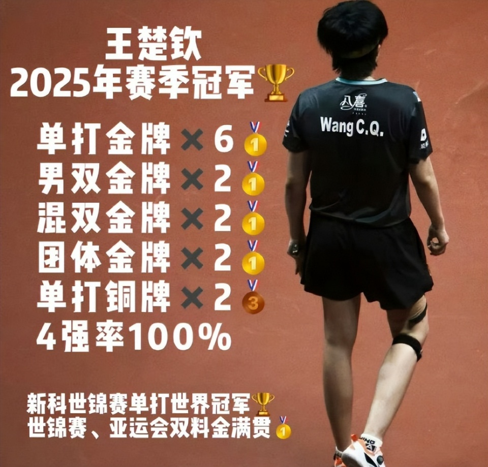 2025赛季王楚钦已经拿到了6个男单冠军,男双2个冠军,混双两个冠军,团体赛两个冠军,单打铜牌2个,这个赛季王楚钦从低谷到崛起还是付出了很多努力。