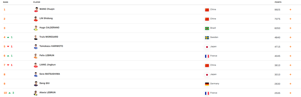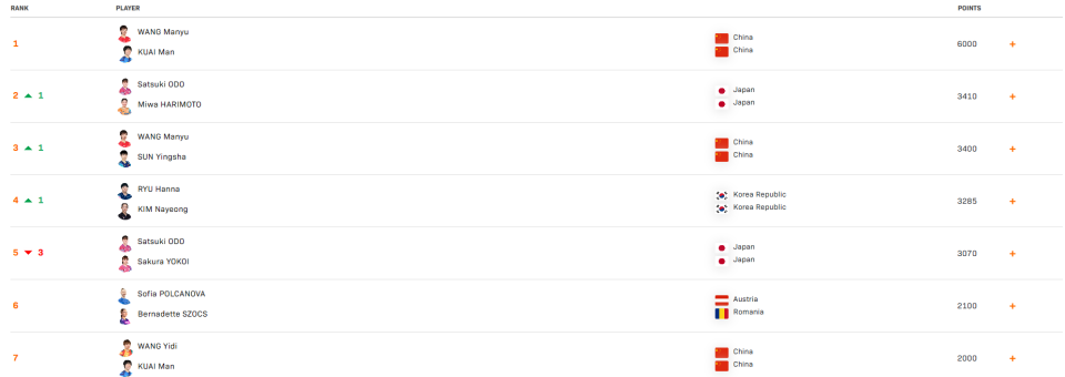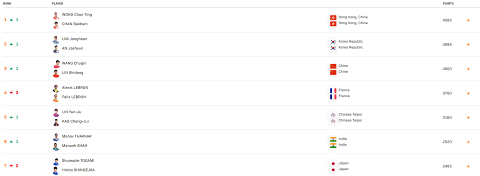 男双发生了重大变化,法国的勒布伦兄弟被扣除了相应积分后从榜首一下掉到第四,中国香港的黄镇廷/陈颢桦升至第一,韩国的安宰贤/林钟勋升至第二,中国的王楚钦/林诗栋升至第三。日本组合户上隼辅/篠冢大登排名从第五降至第七,林昀儒/高承睿和印度的塔卡尔/萨阿排名分别上升1位。中国另一对排在前十的是林诗栋/黄友政,位居第九。