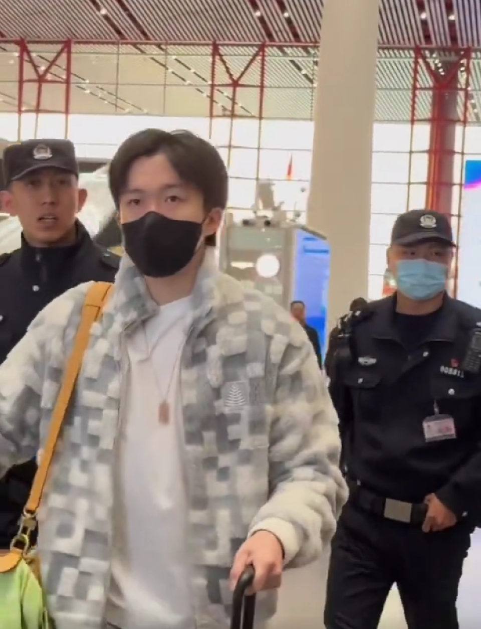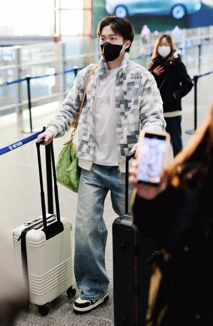 王楚钦梳着小分头,佩戴黑色口罩,两只手各推着一个行李箱,还背着一只LV的绿色包包,气定神闲。