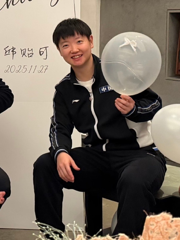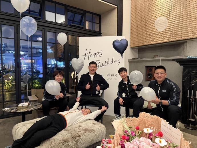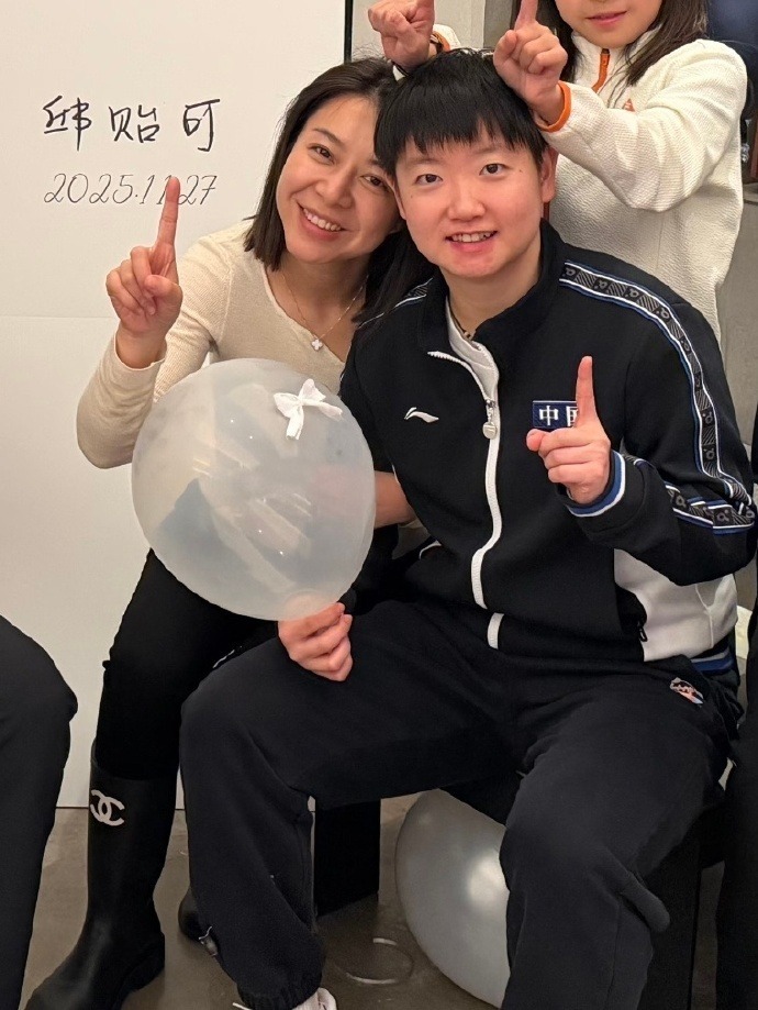 11月27日,国乒教练邱贻可在社交网站晒出自己的生日合照,照片中孙颖莎、蒯曼拿着气球,而因为比赛在成都举办,邱贻可的妻子和女儿也能够为他一起庆祝。