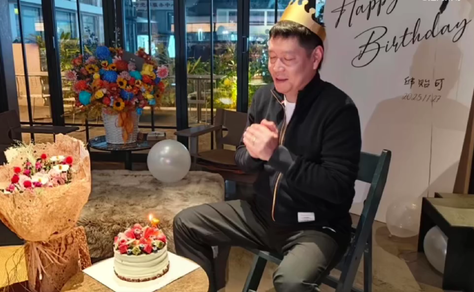 在爱人和爱徒的陪伴下庆祝这个非常有纪念意义的生日,邱贻可也是十分开心,戴着生日帽许下了生日愿望。