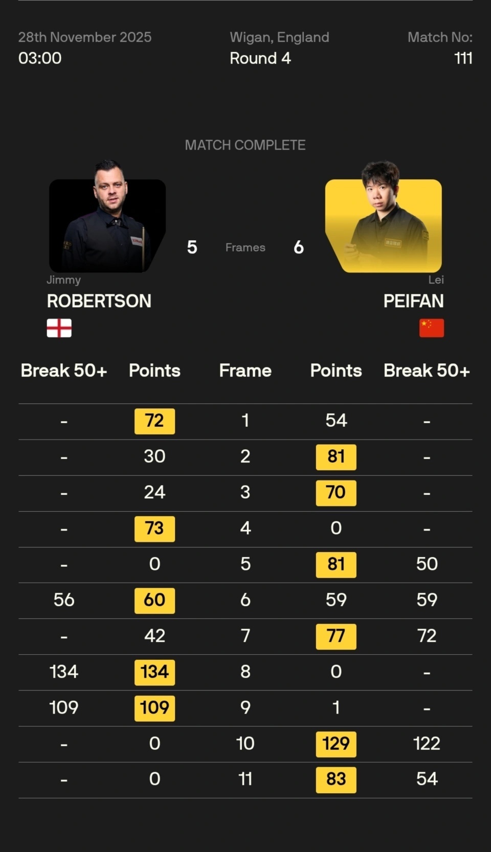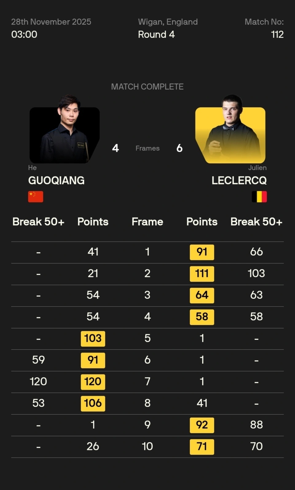 这个比赛日共打出十杆单杆过百,不过其中的六杆来自于出局的球员,吉萝卜打出两杆,国强也有一杆,本届英锦赛资格赛阶段共完成83杆破百,其中常冰玉和利亚姆·普伦完成了各自的首杆147。