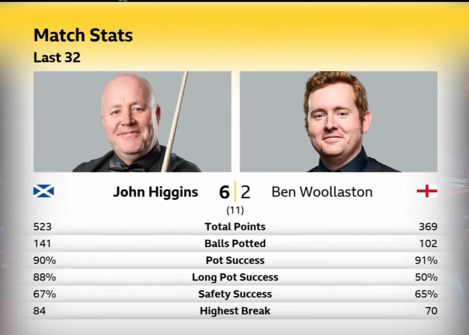 凌晨场,巫师希金斯对阵沃拉斯顿,希金斯打出4杆50+,5-0到赛点。眼看胜利在望,第6局,希金斯单杆58分,被沃拉斯顿一杆70分清台逆转。沃拉斯顿连救两赛点后,希金斯拿下第8局,6-2终结比赛。