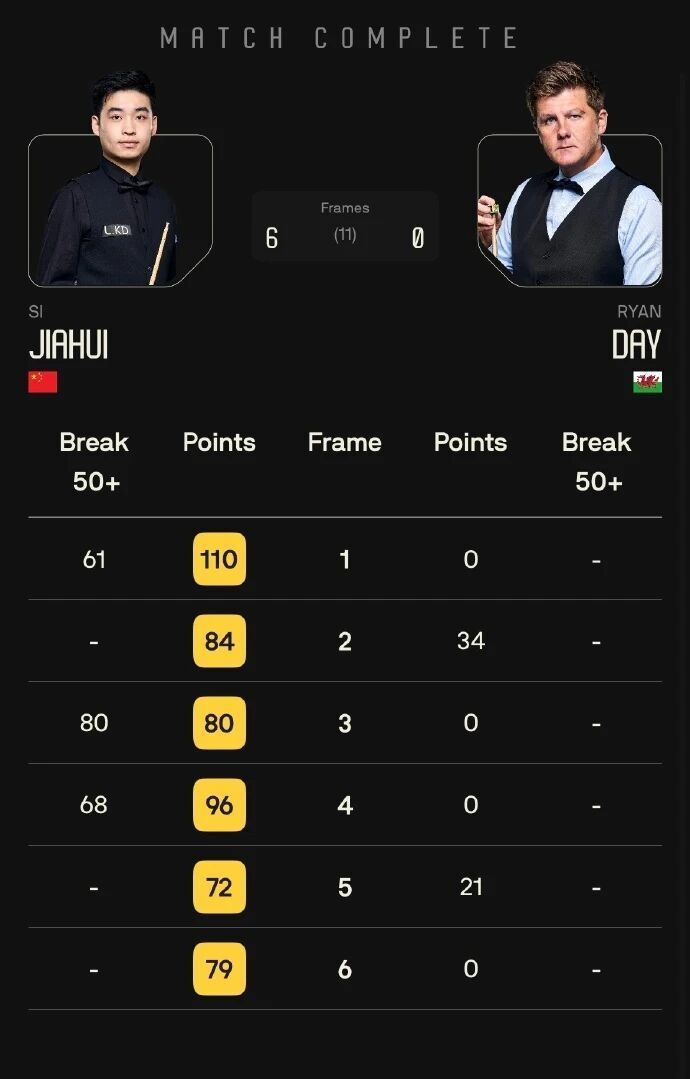 短休后,瑞恩·戴依然不停送机会,斯佳辉拿下第5局后,第6局两次上手,完成超分,6-0横扫晋级。