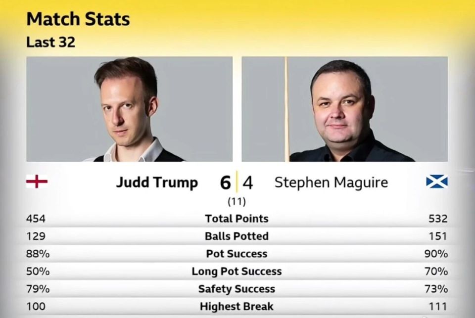 卫冕冠军兼世界第一的特鲁姆普与马奎尔上演揭幕战。首局,小特单杆62分后打进延分蓝球,母球却摔袋,但马奎尔错失一杆逆转机会。而后,小特轰出一杆破百,前四局3-1领先。