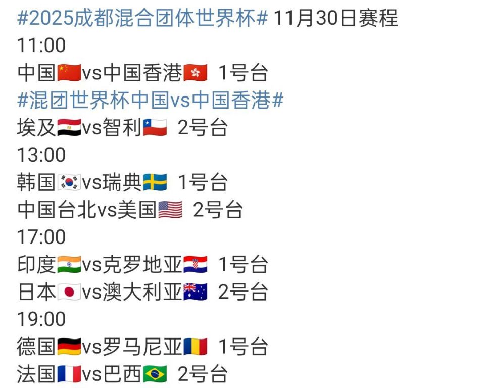 2025年11月30日,乒乓球混合团体世界杯迎来首个比赛日,国乒将对阵小组赛第一个对手中国香港队,双方实力差距比较明显,国乒基本稳操胜券,总的来说这个阶段没难度,重头戏在后面。