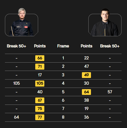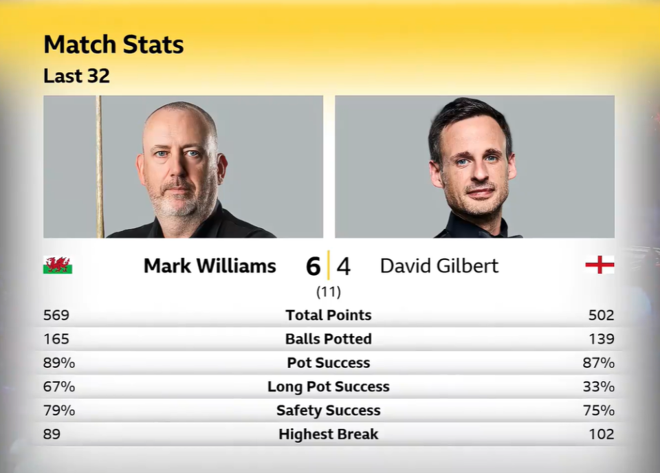 马克-威廉姆斯和土豆哥吉尔伯特的比赛,前四局,双方战平。短休后,老马连续打出两杆70+,连赢3局,5-2到赛点。绝境下的土豆哥,打出一杆破百和一杆50+,连救两赛点。