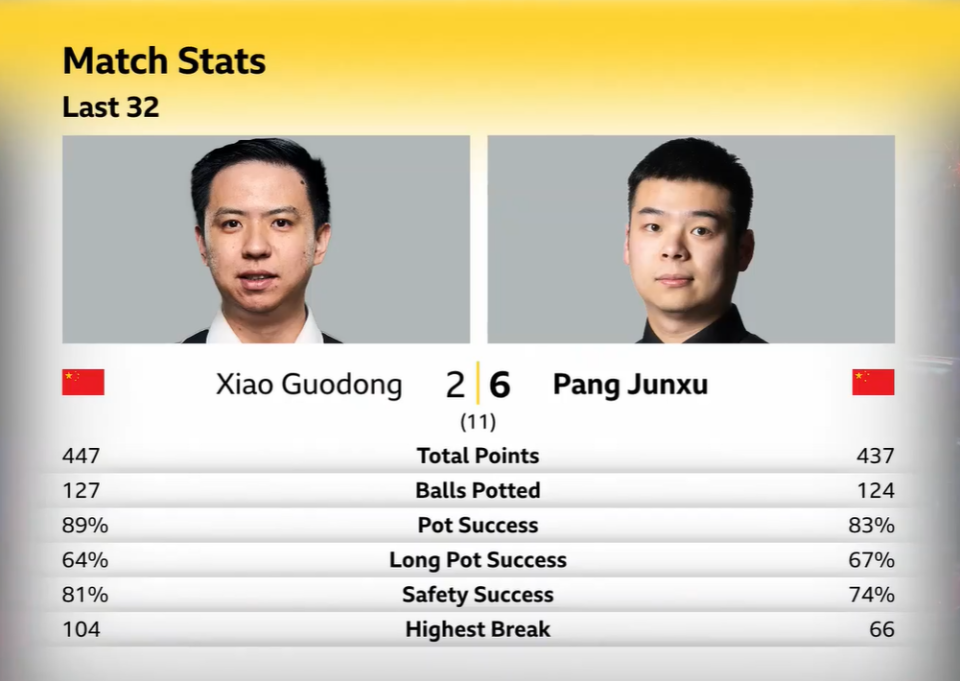 第8局,肖国栋单杆59分后打丢超分球,而后粉黑争夺时,母球摔袋;庞俊旭长台准进粉球,打进贴库黑球,单局逆转同时,6-2淘汰肖国栋。