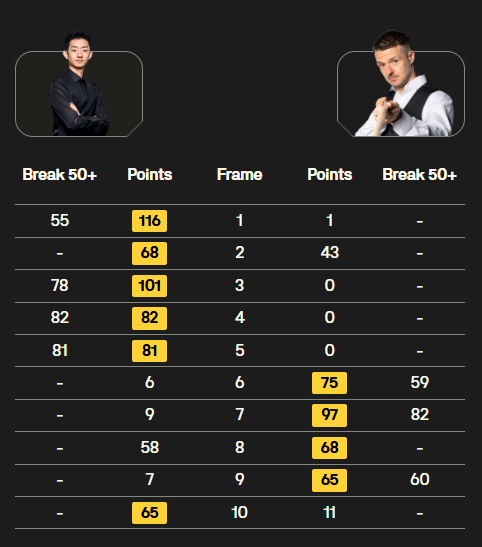 世界排名第13位的吴宜泽对阵世界排名第64位的刺客霍尔特。前面的进程非常顺利,霍尔特多有失误,吴宜泽打出3杆50+,4-0领先。前四局,霍尔特的进球只有76%,而吴宜泽是92%。感觉这比赛会像斯佳辉的比赛那样,一边倒。