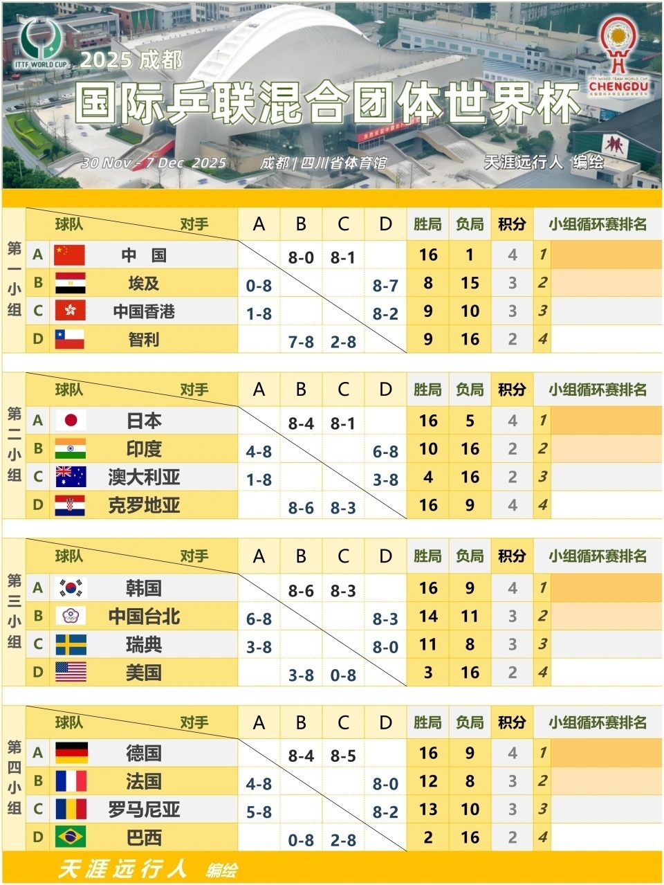 2025成都国际乒联混合团体世界杯小组循环赛进程签表