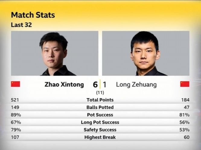 本场比赛,赵心童打出一杆107分破百和68、51、59、72分4杆单杆50+,龙泽煌仅仅在第六局打出一杆单杆60分,扳回一局。