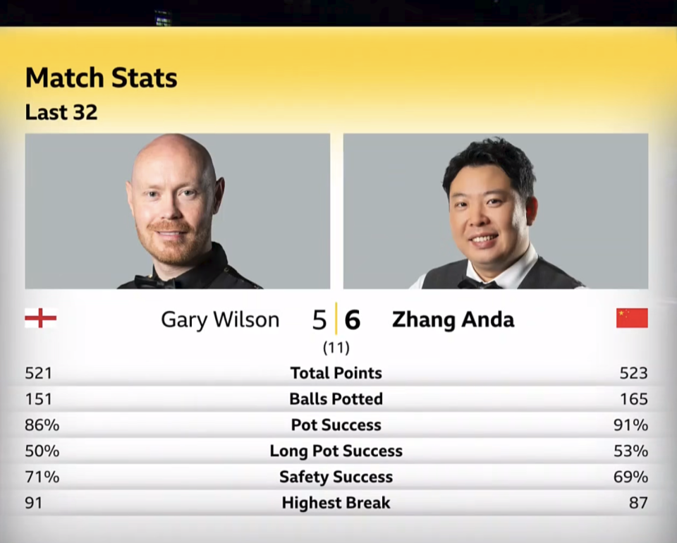 在张安达与加里威尔逊的对决中,张安达2-1领先,然后被反超至2-3,再到3-3。张安达又以3-5落后,连追2局将比赛带到决胜局。在紧张刺激的第11局中,张安达再胜,6-5赢得漂亮。本场比赛张安达有1次单杆87分,还有单杆77分、73分。另一场比赛中,种子选手艾伦0-3落后唐纳森,追至1-3后,艾伦又连丢3局,以1-6被淘汰!外界以为艾伦将对阵丁俊晖,但现在丁俊晖的16强对手发生变化。