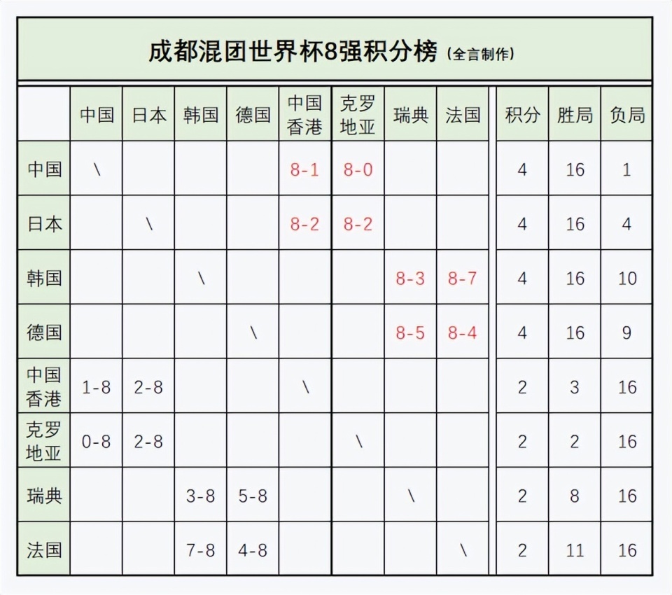 头号种子中国队赢得最轻松,8-0就拿下了从小组赛中爆冷出线的克罗地亚队;二号种子日本队同样发挥稳定,结果8-2战胜中国香港;三号种子韩国队险些崩盘,打满15局才8-7拿下法国;四号种子德国队则是与瑞典激战13局后8-5胜出——第二阶段最新积分榜如下(此前有过交手的队伍直接带入第一阶段比分):
