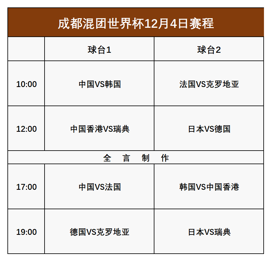 混团世界杯:12月4日赛程公布!国乒迎战韩法,日本对决德瑞