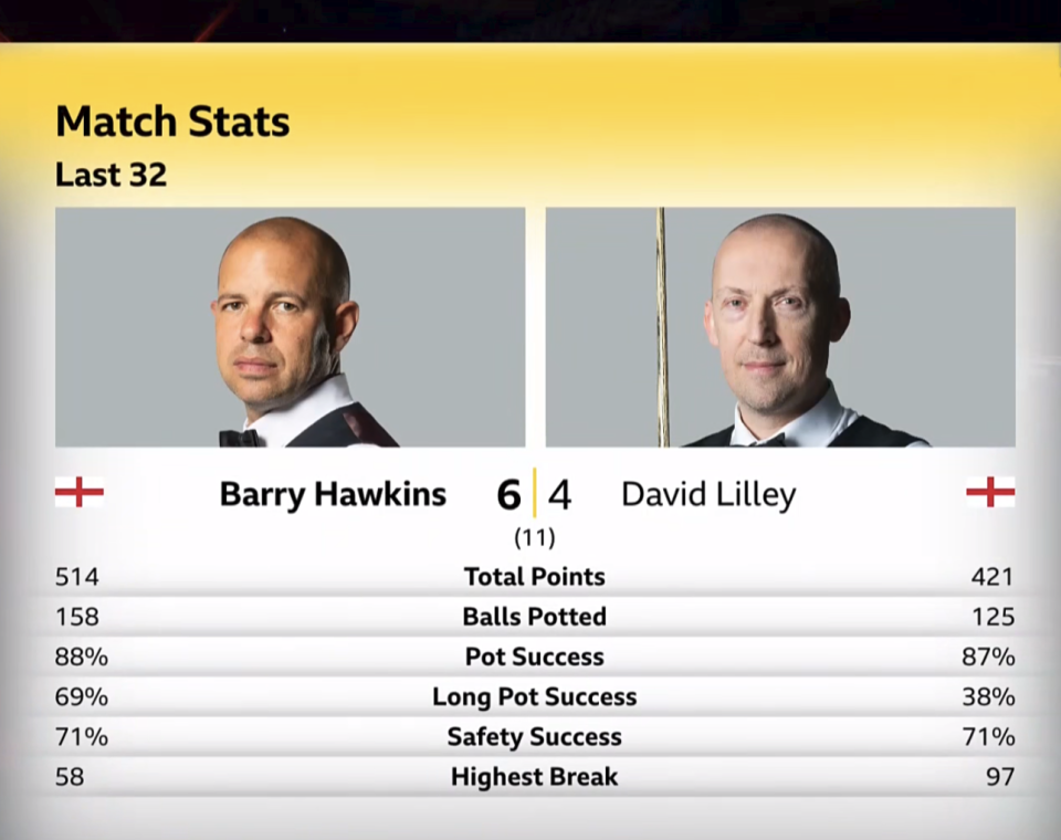 而同一时间出场的霍金斯则淘汰了资格赛选手大卫利利,本场霍金斯在2-3落后的情况下,反超至5-3,最后6-4取得胜利。整场比赛中,霍金斯完成2次单杆50+。