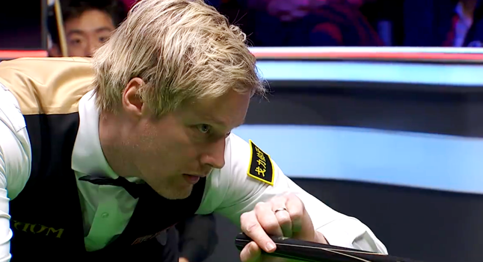 晚间,世界排名第13位的吴宜泽,对阵世界排名第3位的澳洲火炮尼尔·罗伯逊。首局,吴宜泽单杆62分完成超分后,打丢锁定胜局的黑球,差一点被罗伯逊1分单局逆转。此后,吴宜泽多个失误,包括简单球失误,开始连续丢分。第4局,吴宜泽打丢单局逆转机会,罗伯逊3-1领先。前四局,吴宜泽的进球成功率是78%。
