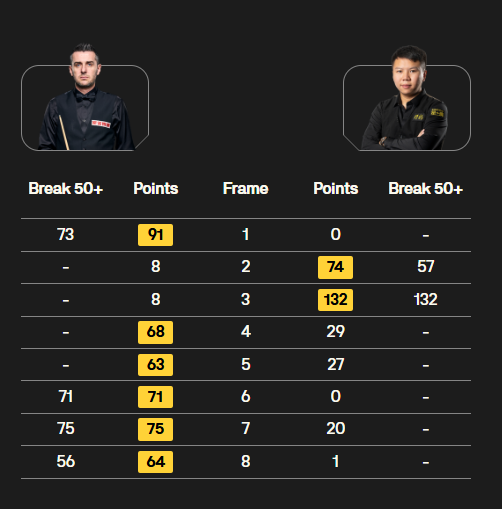 短休后,庞俊旭再下一城,4-1领先。而后老马再添一杆破百,连追两局。第8局,老马误进红球,有难度的局面,庞俊旭打出一杆53分完成超分,5-3到赛点。第9局,庞俊旭抓住老马长台,一杆破百收工,6-3送走老马。